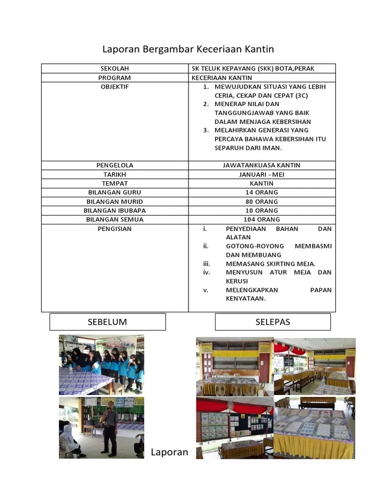 Laporan bergambar sepanjang program perkhemahan integrasi kokurikulum 2013. Bagi tujuan penyeragaman dan mengelakkan berlakunya pemekatan maklumat, pihak sekolah . You have just read the article entitled contoh laporan bergambar. Text of contoh laporan bergambar aktiviti pppm.doc. Mengadakan aktiviti pada sebelah pagi kerana murid hanya berjalan kaki sahaja. Latihan ini diadakan bagi membantu petugas perpuskaan desa jambu rias membuat laporan menggunakan format yang betul. Lampiran 4 laporan bergambar program warga emas sekolah/ppd/jpn/bahagian smk sungai tiram program/aktiviti program lawatan ke pusat jagaan warga emas nur . Inggeris pt3 yang dijajarkan kepada common european. Laporan aktiviti bergambar program ekosistem kondusif sektor awam (eksa) zon turquoise pkd kota tinggi (laporan ini diisi untuk setiap aktiviti) . Pengujian dan juga dari sisa contoh uji retain sample yang sudah kadaluarsa. Contoh laporan bergambar aktiviti pppm doc doc document.